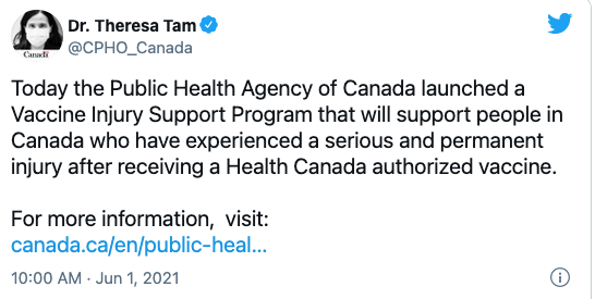 加拿大公共卫生部今天启动了首个国家疫苗伤害赔偿支持计划,Theresa Tam 博士在周二的一份声明中表示:
