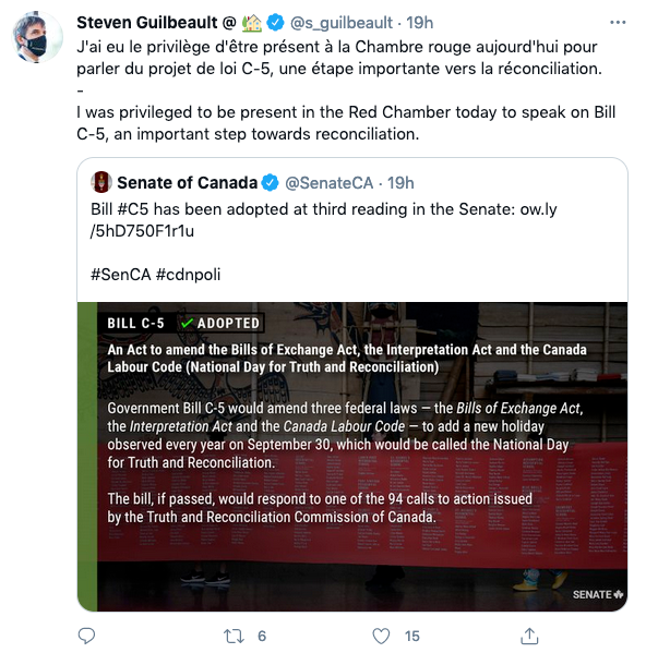 负责此项法案的加拿大遗产部长史蒂文·圭宝特(Steven Guibeault)也发推特称说道表示成立这个纪念日是“步向和解的重要一步。”