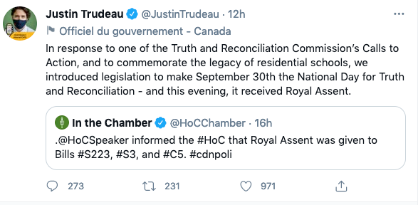 特鲁多总理在昨日(6月3日)的推特上写道:“为了响应真相与和解委员会的号召,并且为了纪念寄宿学校死去的孩子们,我们将每年的9月30日作为真理与和解日。今晚,法案已经通过。”