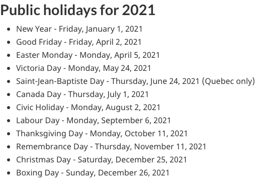 加拿大假日,包括联邦法定假日和各省自己的假日。