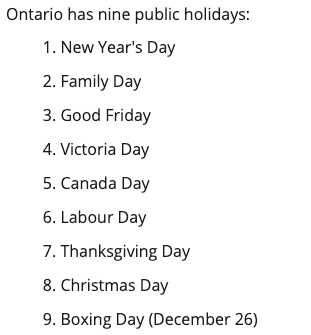 而安省假日则只有9天,元旦,家庭日、复活节受难日、维多利亚日、国庆日、劳工节、感恩节、圣诞节、Boxing day。