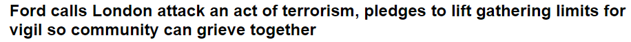 “对于安省伦敦的穆斯林社区和全国各地的穆斯林们,请知道我们与你们并肩同在。我们的任何社区都不允许伊斯兰恐惧症的存在。这种仇恨是阴险和卑鄙的,这必须停止。”