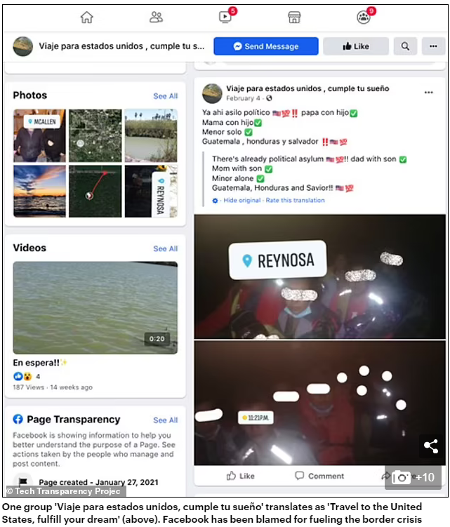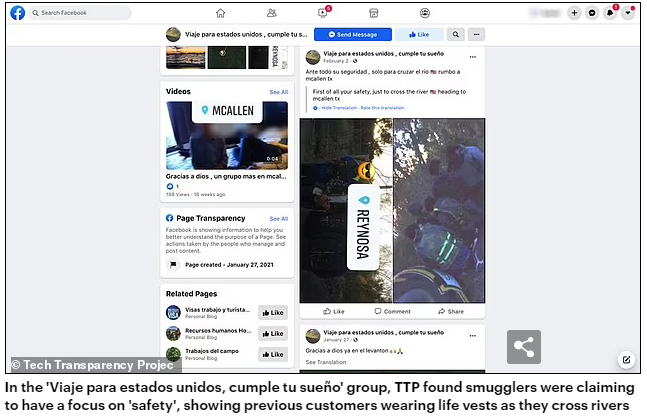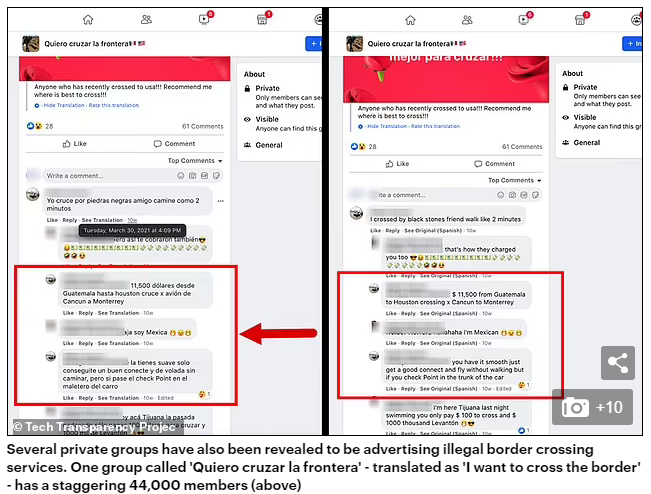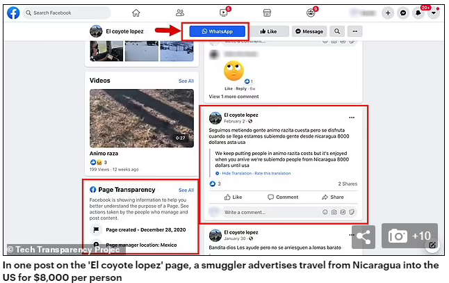 脸书上有数十个群组和页面公开提供跨越美墨边境的非法过境点,发布价格、路线、折扣选项,蛇头还发布了偷渡成功的视频 - 甚至他们声称获得了“移民客户”的好评。