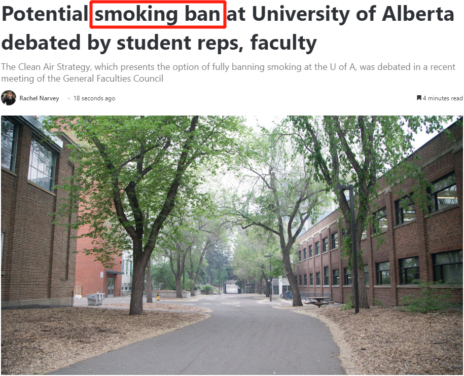 General Faculties Council(GFC),要求大学行政部门指定计划,以尽量减少学生、教职员工,接触香烟、水烟、电子烟及大麻!