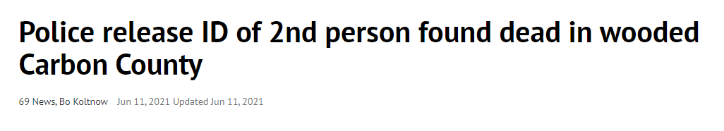 根据宾州警方消息,5月22日下午约5点14分,宾夕法尼亚州东部的Carbon County小镇Lausanne Township以西的一处茂密树丛中,发现了一男一女两具尸体。