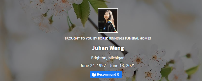 据了解,1997年出生的菊涵来自内蒙古自治区的包头市,密歇根州一个讣告网站页面上写道:"菊涵将被人们铭记为这个世界上最好的女儿、姐姐、和孙女。"
