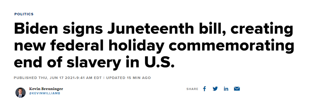 拜登签署「六月节」成联邦假期,6月19日政府、邮局放假...