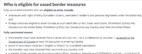 旅行者可以在任何国家/地区接种这些疫苗或组合,并且必须提供支持其疫苗接种的英语、法语或经过认证的翻译文件。 为了使这些新措施适用于他们,完全接种疫苗的旅行者仍必须满足所有其他强制性要求,包括抵达前和抵达时的检测。 完全接种疫苗的旅行者还必须没有任何新冠症状,持有其疫苗接种文件的纸质或数字副本,并在抵达加拿大之前通过ArriveCAN手机程序以电子方式提供COVID-19相关信息。