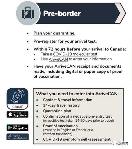 2、预先登记入境检测 3、72小时核酸阴性报告 4、完全接种疫苗的旅行者必须通过将英语或法语文件(或经过认证的翻译)上传到 ArriveCAN 应用程序来提供其接种疫苗的证据。 入境: 1、提供所需的资料和文件,包括疫苗接种证明(如果要求) 2、回答所有资格、疫苗接种和健康筛选问题。 3、入境核酸测试 4、如果您有症状或不符合豁免要求,按照边境人员提供的指示做