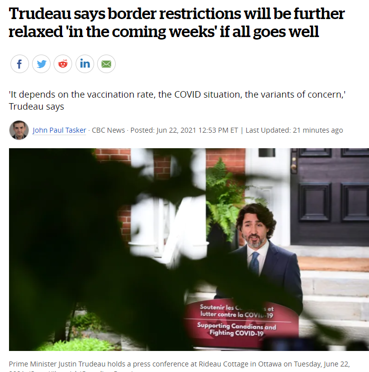 隧道尽头的光越来越亮。刚刚,总理特鲁多表示,如果一切顺利,未来几周,加拿大将进一步放松边境限制!
