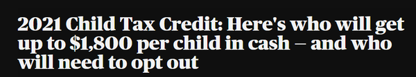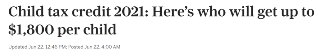 据悉,从7月15日起,全美约3600万个家庭将开始收到来自美国国税局IRS的支票。符合条件的家庭将在今年12月前获得最多$1800美元/每个儿童的补贴(全年是$3600,半年$1800)。