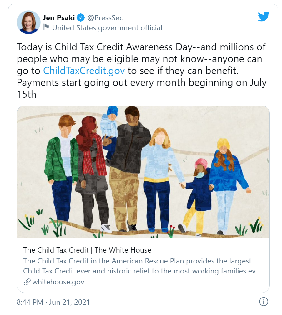 不仅如此,白宫新闻发言人Jen Psaki在6月21日周一表示,政府已提议每月补助再延长五年