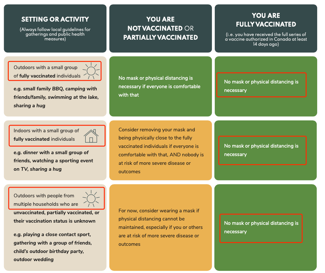 随着疫苗接种率不断提高,加拿大公共卫生局(Public Health Agency of Canada,简称PHAC)6月25日发布了完全接种疫苗的指引,所有五个场合基本都可以不用戴口罩了,包括室内室外聚集。