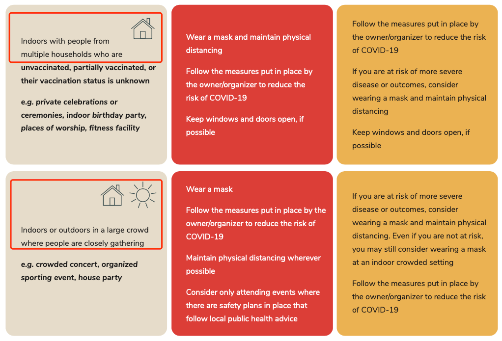 指引:对于完全接种者,遵循所有者/组织者为降低 COVID-19 风险而采取的措施;如果您有风险会患上严重疾病,请考虑戴上口罩并保持身体距离;如果可能,保持门窗打开。