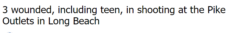 长滩奥特莱斯曝枪击 多人中弹6月26日晚上,长滩市派克奥特莱斯(Pike Outlets)发生枪击事件,造成包括一名青少年在内的三人受伤。