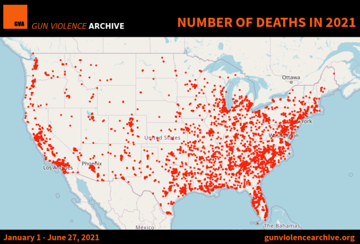 图:美国2021年1月至6月枪击致死分布图