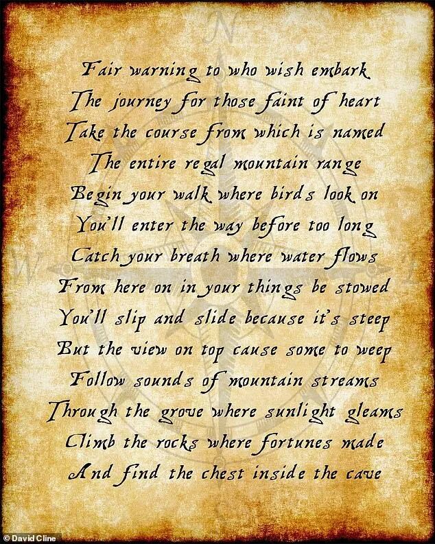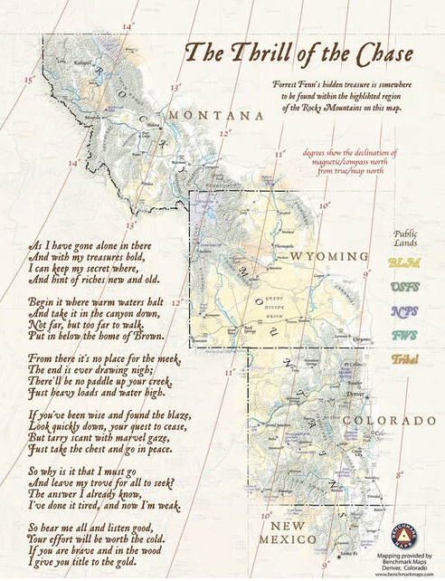 芬恩将这个宝藏箱子藏在跨越新墨西哥州、科罗拉多州、怀俄明州和蒙大拿州的落基山脉某处,随后写了一首24行诗作为藏宝图的线索,这首诗发表在他2010年出版的自传《追逐的刺激》(the Thrill of the Chase)中。