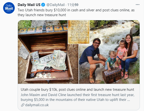 为了让大家早日从疫情中走出来,2名美国居民突发奇想,在山里埋下一个藏宝箱,里放了10000美元现金和10盎司银币。