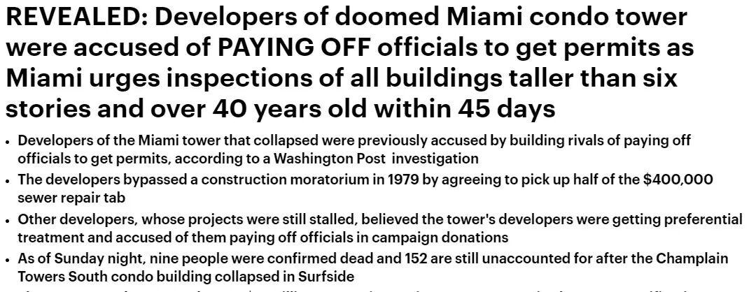 据《华盛顿邮报》报道,公寓的开放商Surfside Champlain Towers South 曾被指控在 1981 年的施工期间,至少给两位镇委员会成员行贿,以获得优惠待遇。