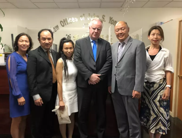 郑斌夫妻向律师致谢,左起依次为翁振信律师楼律师助理刘艳娟、郑斌、林静、律师Dan Lynch、律师翁振信、律师助理李静。