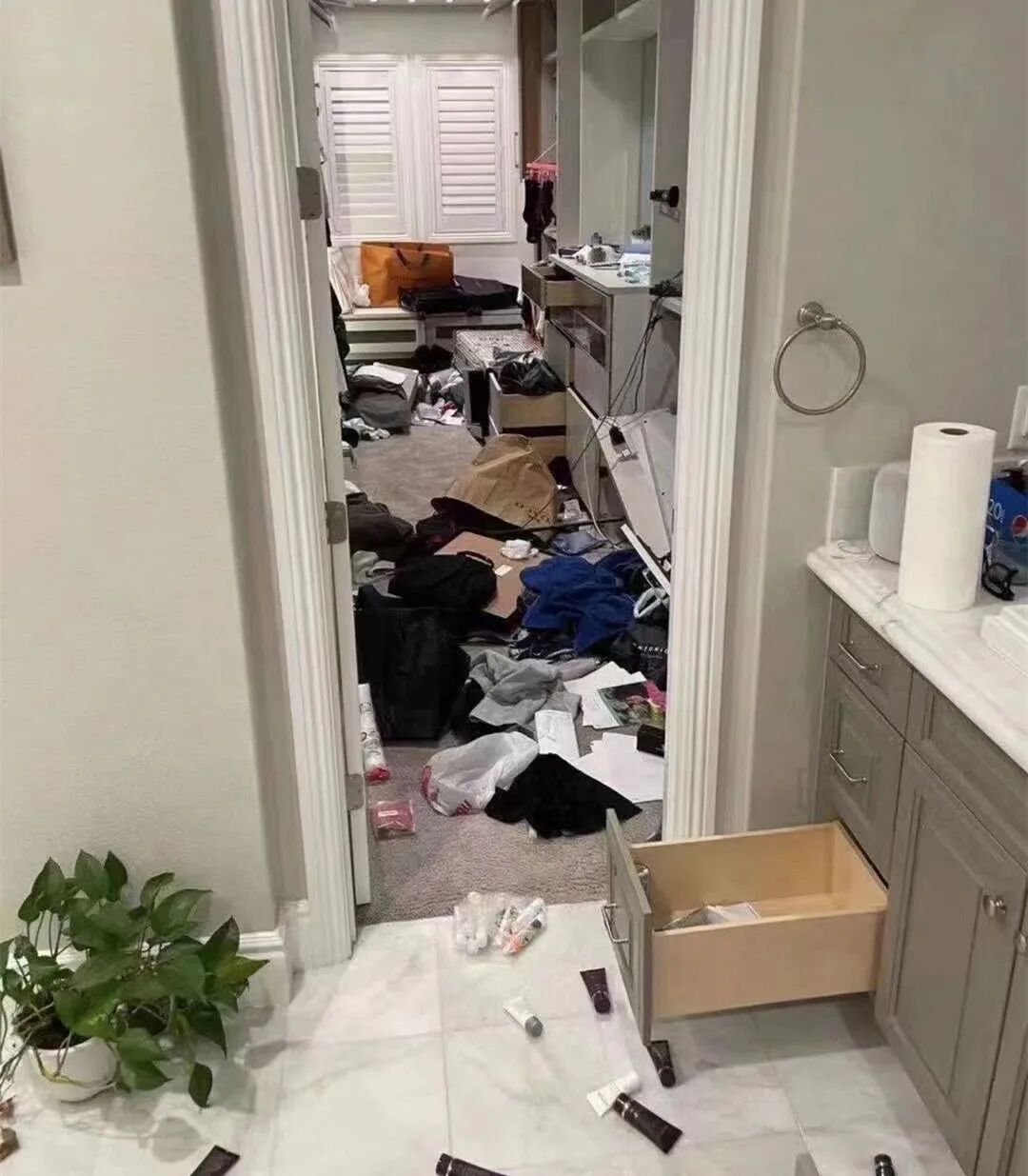 劫匪将每一个房间都洗劫一空后,将受害人锁在浴室,并用家具将浴室门堵上,防止她逃跑。
