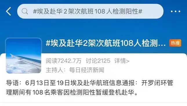 2架次回国的航班108人检测阳性,导致起飞地埃及赴华多架航班暂停执飞。