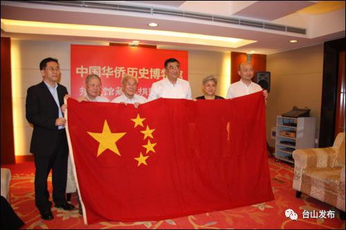 ▲2009年9月14日,衣联会访华团团长陈锦棠(左三)向中国华侨历史博物馆代表捐赠国旗。