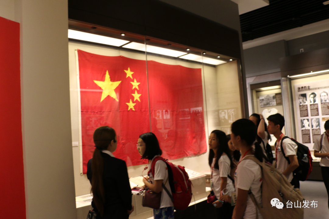 ▲2018年7月,美国侨報小记者在中国华侨历史博物馆参观衣联会当年升起的五星红旗。(照片由中国华侨历史博物馆提供)
