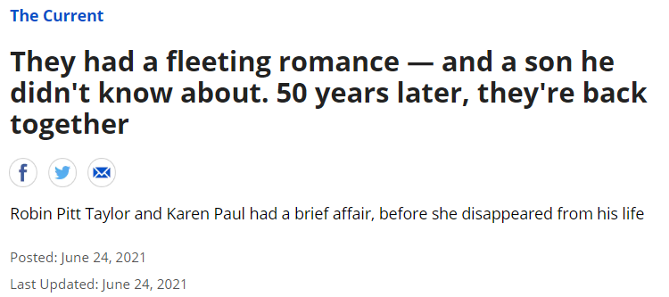 大约50年前,21岁的Robin Pitt Taylor和19岁的Karen Paul曾有一段短暂的恋情。