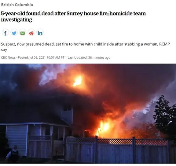 根据本周二(7月6日)一早的最新消息,5日晚上,素里市94 Avenue的15400-block发生一起放火捅伤案件,2人死亡,其中一名受害者是5岁孩童!