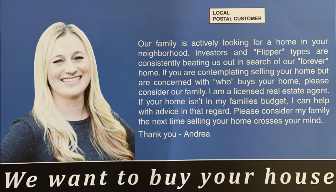 还有一些买家会选择怀柔战略,他们会给卖家寄明信片或传单,向卖家表示自己强烈的买房意愿。甚至还有人会给卖家写“情书”,或是介绍自己的工作、家庭来博取卖家好感。