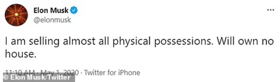 去年,马斯克发推说自己准备放弃“几乎所有实物财产”,回应对他巨额财富的批评。网友们都吃瓜看戏等后续,谁知这一年里马斯克还真说到做到!