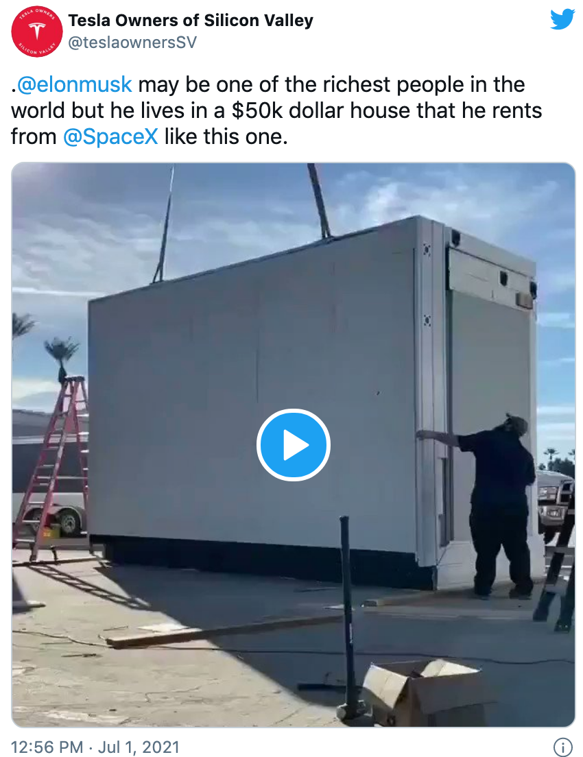 在楼市清仓了,连湾区的最后一套房产最近也卖掉了。 那他住哪呢?和以前动辄千万美元的豪宅对比实在太过悬殊,今年6月,马斯克透露自己租了套价值5万美元的...活动板房......而且正式宣布他现在已经住了进去!没错,就是加州安排游民暂住的那种临时屋。比如这样的