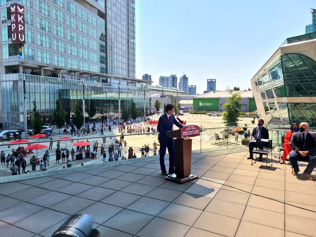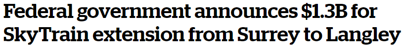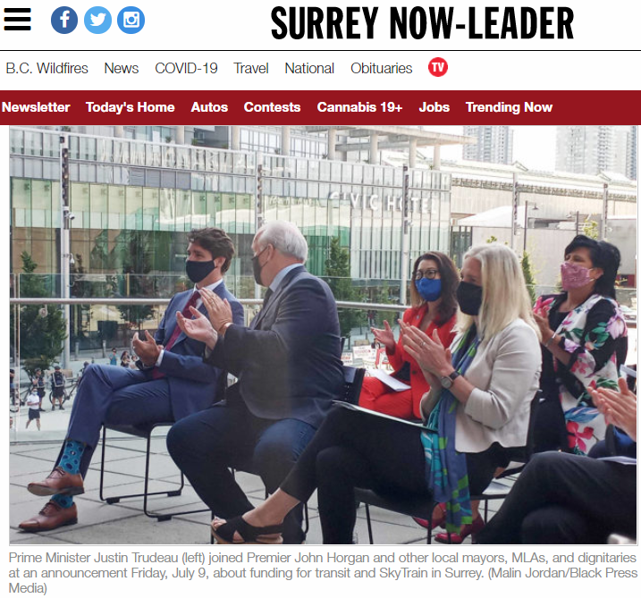 7月9日,总理特鲁多现身大温,宣布联邦政府将出资13亿加元,将温哥华的天车线从素里延伸到邻近的兰里。