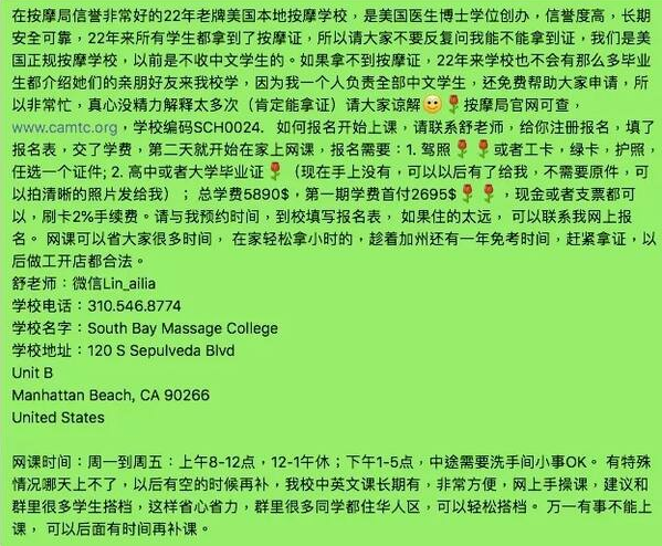 加州一名华裔女子和其白人丈夫专门开了一家按摩学院,中文招收华人学员,他们承诺,在该处学习按摩课,学完可以拿到加州按摩局证书、开店、打工100%没有问题。