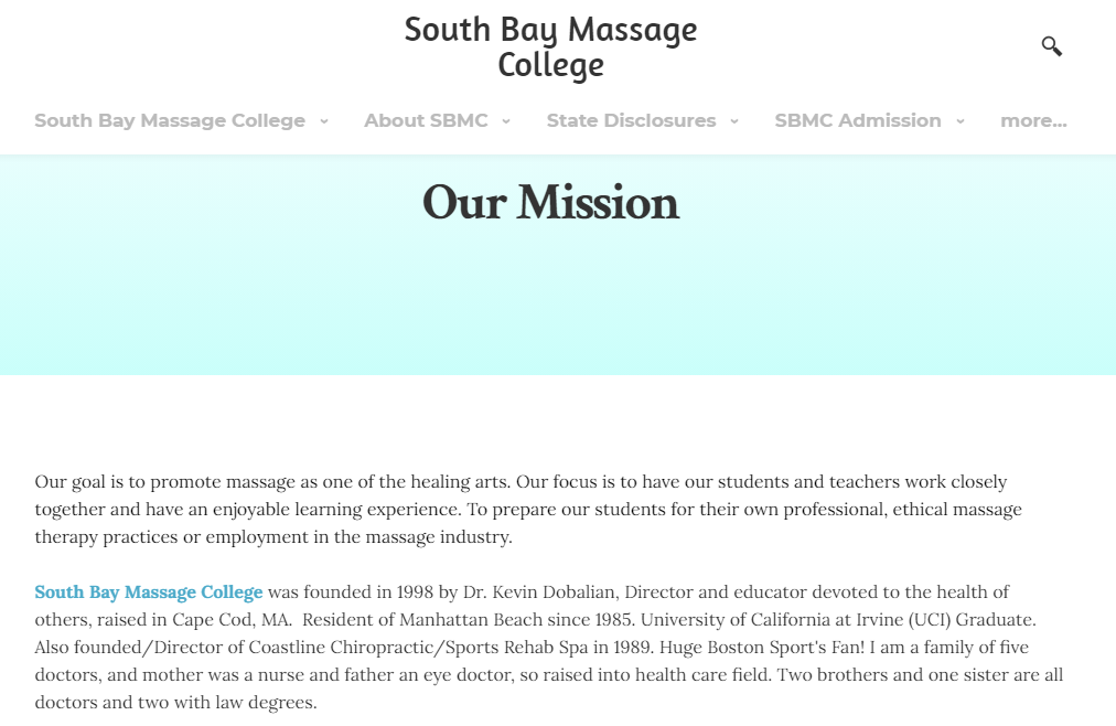 根据学校网站上内容报道,这家学院于1998年由教育家Kevin Dobalian博士创建,他在马萨诸塞州科德角长大。 自1985年以来一直居住在曼哈顿海滩。加州大学欧文分校(UCI)毕业。1989年还创办了Coastline Chiropractic/Sports Rehab Spa并担任主任。他自称是一个由五个医生组成的家庭,母亲是护士,父亲是眼科医生,所以从小就在保健领域长大,两个兄弟和一个姐妹都是医生,两个有法律学位。