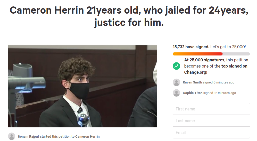由于求情的网友太多了,现在还出现了一个专门的请愿页面,名字就叫“Justice for Cameron Herrin” (为Herrin争取正义)!