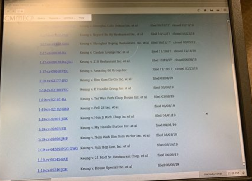 根据纽约南区联邦法庭的记录,2019年三个月林国强吿了10家中餐馆,包括「梅洋店」。