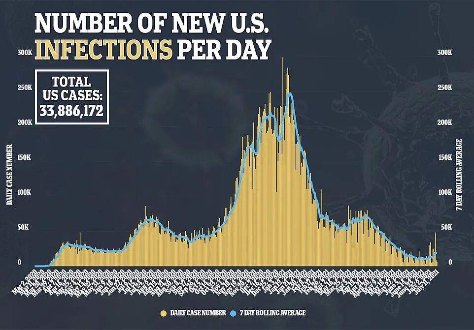 疫情反弹 感染病例一路飙升美国抗疫的现状不容乐观。 美国现在平均每天记录 23,000 例新冠病例,这是自5月下旬以来的最高数字。 而Delta变种病例,占美国所有新感染病例的一半以上,在某些州高达 97%。 根据约翰霍普金斯大学数据的分析,目前,43 个州和哥伦比亚特区的新冠感染人数均有增加。 其中,在过去14天内,有15个州的病例至少翻了一番,大部分位于南部且疫苗接种率较低。 全美至少接种一剂疫苗的成年人比例已经停滞在 68%。 根据约翰霍普金斯大学的数据,共有43个州和哥伦比亚特区的感染人数增加。 世卫警告不要混打疫苗