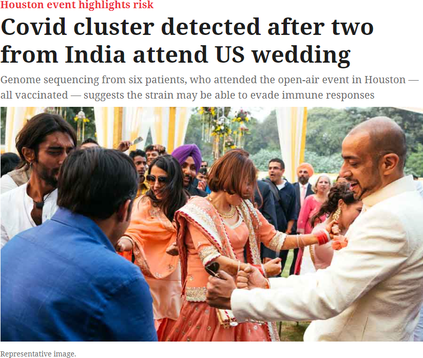 综合《休士顿纪事报》与《印度电讯报》报导,美国一对夫妇4月在休士顿举行户外婚礼,并要求所有宾客必须提供完整接种证明。 其中2名来自印度的男女宾客在10天前接种了第二剂印度国产Covaxin疫苗,女子在婚礼结束当晚感觉身体疲劳,男子则在2天后出现咳嗽,第3天两人都开始发烧,隔日双双确诊Delta变种病毒。