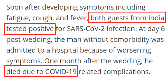 报导称,婚宴中与这对印度男女有过近距离接触的4名宾客也相继确诊,「突破性感染」了Delta变异株;