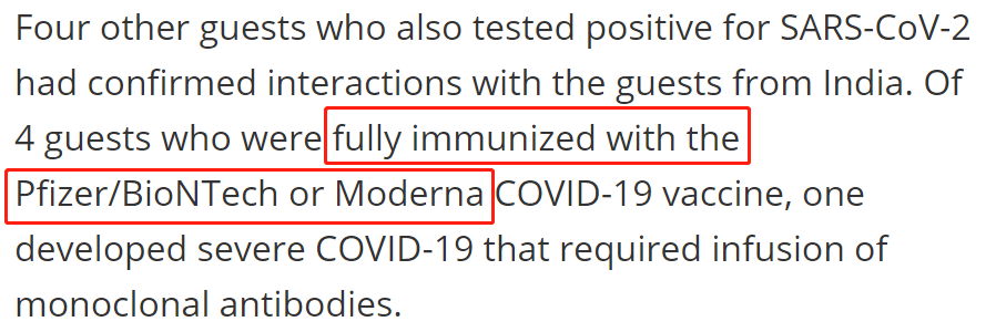 4人中接种莫德纳疫苗与辉瑞疫苗者各有2人,其中一名接种过辉瑞的确诊者患有糖尿病,病况发展成重症,住院接受单株抗体治疗。 通过这起传播事件,研究人员认为,不管是辉瑞、Moderna,还是印度的Covaxin疫苗,都不足以提供针对Delta变种的全面保护。 另外,德州奥斯汀(Austin)一个青年营队(youth camp)已经有超过百人确诊,专家担心感染数将突破200人。 报导指出,辉瑞与莫德纳疫苗对原始毒株的有效性为95%与94%,但对于Delta变异株的效力则落在64%到88%不等。