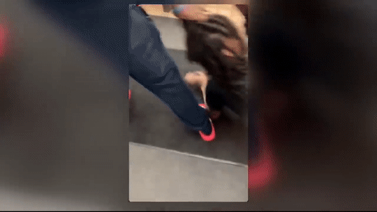 随后镜头在争吵中摇晃,几秒钟后,她把男子推倒在地。