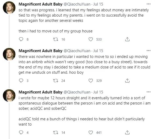 上周四开始,Yuan一连发了一条35条推文,抱怨父母一直在经济上支持他这件事儿让他相当苦恼,尽管他已经三年没有工作了。