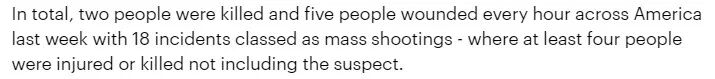 这意味着上周,美国平均每12分钟就会发生一次枪击事件,每小时就会有2人死亡,5人受伤。