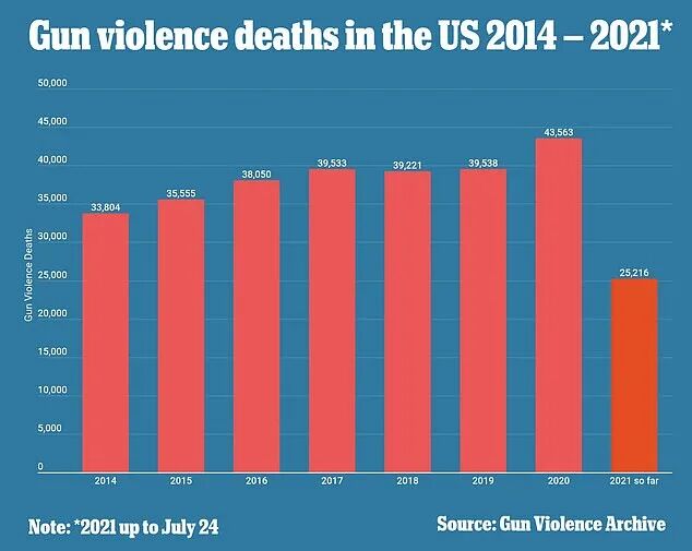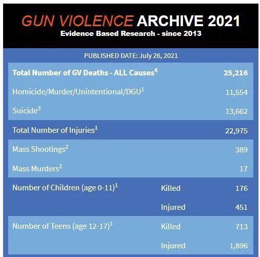从2021年开始到7月24日,全美已有 25,216 人死于枪支暴力,包括713名青少年。这意味着2021年,平均每天有123人死于枪击。