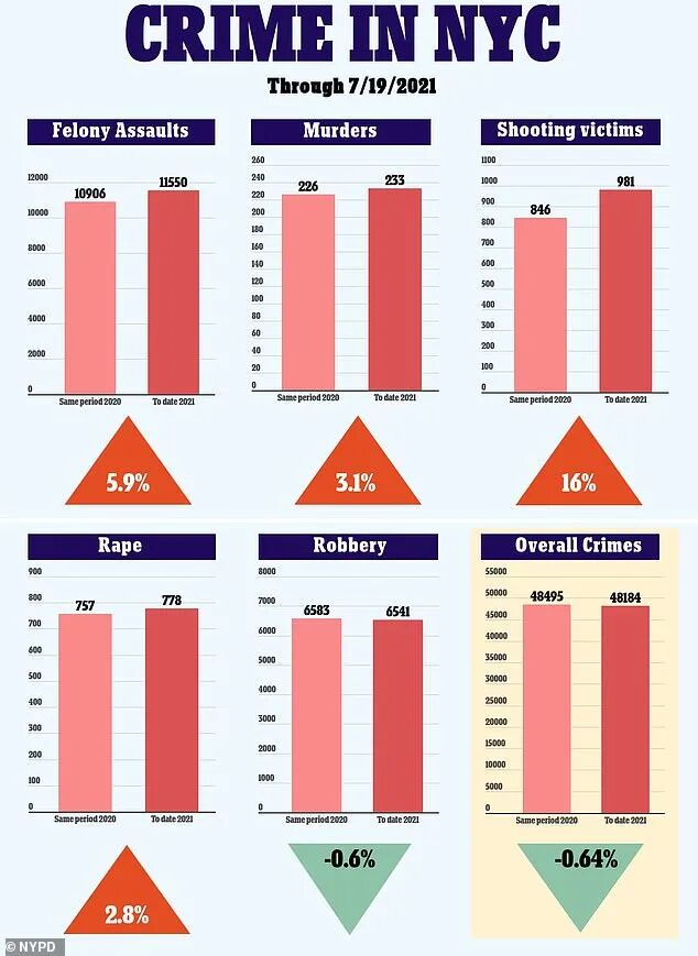 纽约市今年尤其受到犯罪浪潮的冲击,截至7月18日,2021 年的枪击事件比去年激增了 21.9%。枪击受害者人数也增加了 16%,达到了981 人。