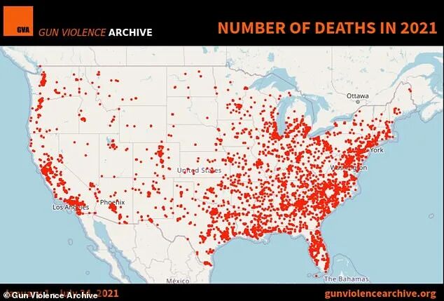 红点代表2021年目前因枪击事件而死亡的人数 图片截自gunviolencearchive.org,版权属于原作者