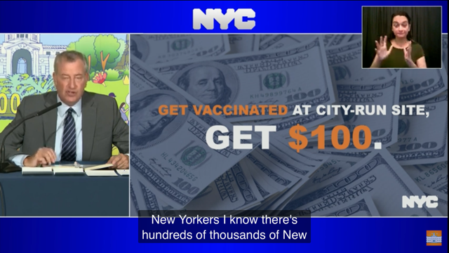 市长白思豪宣布纽约人打疫苗可领取100元。(记者会视频)