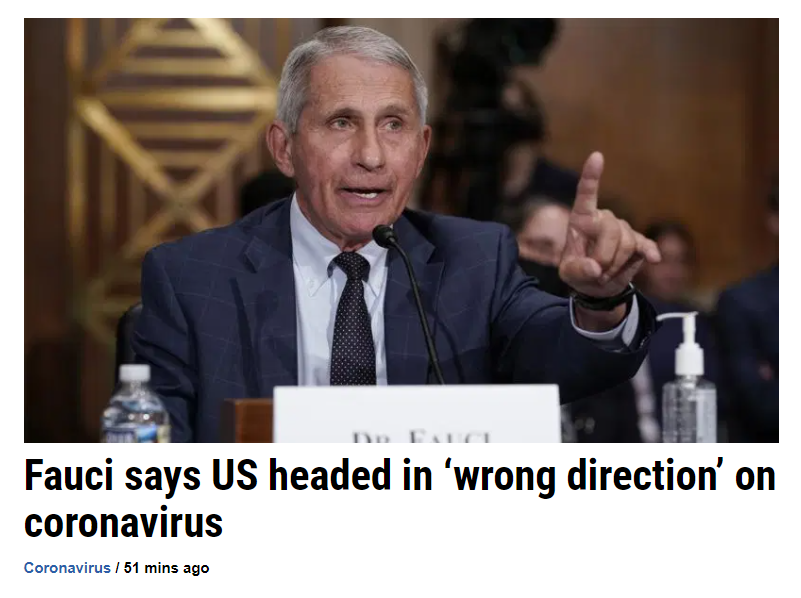 2020年3月8日 传染病顶级专家、白宫防疫顾问安东尼·福西博士在哥伦比亚广播公司的《60分钟》节目中鼓吹大家不用戴口罩,他说:“没有理由戴着口罩四处走动。当你处于疫情爆发期间,戴口罩可能会让人们感觉好一点,甚至可能会阻挡飞沫,但它并没有提供人们认为的完美保护。” 2020年4月3日 CDC撤销决定,建议美国人在公共场合戴口罩。 2020年7月14日 CDC 重申对口罩的支持,发布数据称口罩可防止 COVID 传播。 2021年4月27日 CDC 表示已接种疫苗的美国人,在户外不必戴口罩  2021年5月13日 CDC 表示,在大多数情况下,那些完全接种疫苗的人,在室内也不必戴口罩。 2021年7月27日 CDC撤销之前的口罩决定,建议接种疫苗的人在 Delta 变种激增的情况下,在热点地区需要戴口罩。